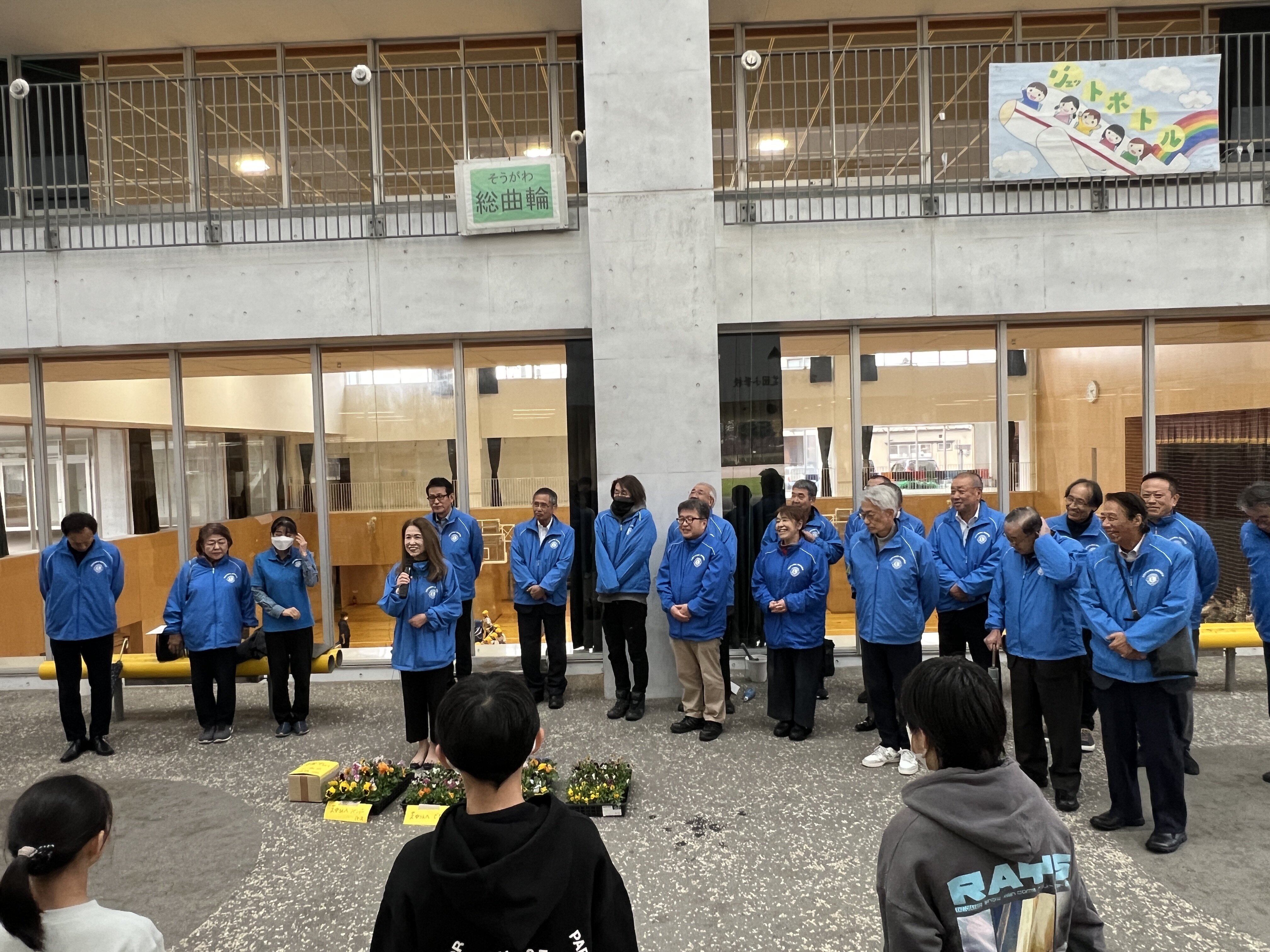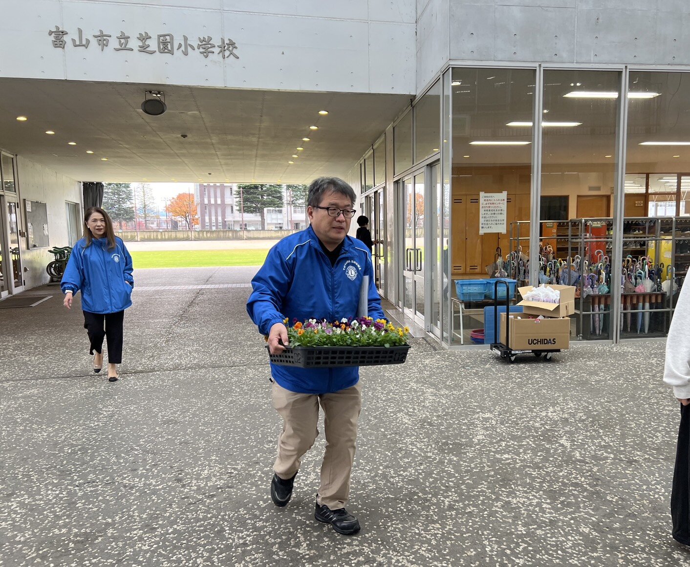 2008年に富山市立芝園小学校が統合新築されて以来、毎年秋に実施している花壇作り活動ですが、今年は雨天のため、子どもたちと一緒に行う予定だった植え付け作業が出来ませんでした。そのため当日は、芝園小、そして隣接している芝園中の代表の児童生徒へ球根や花苗の贈呈式を行いました。
