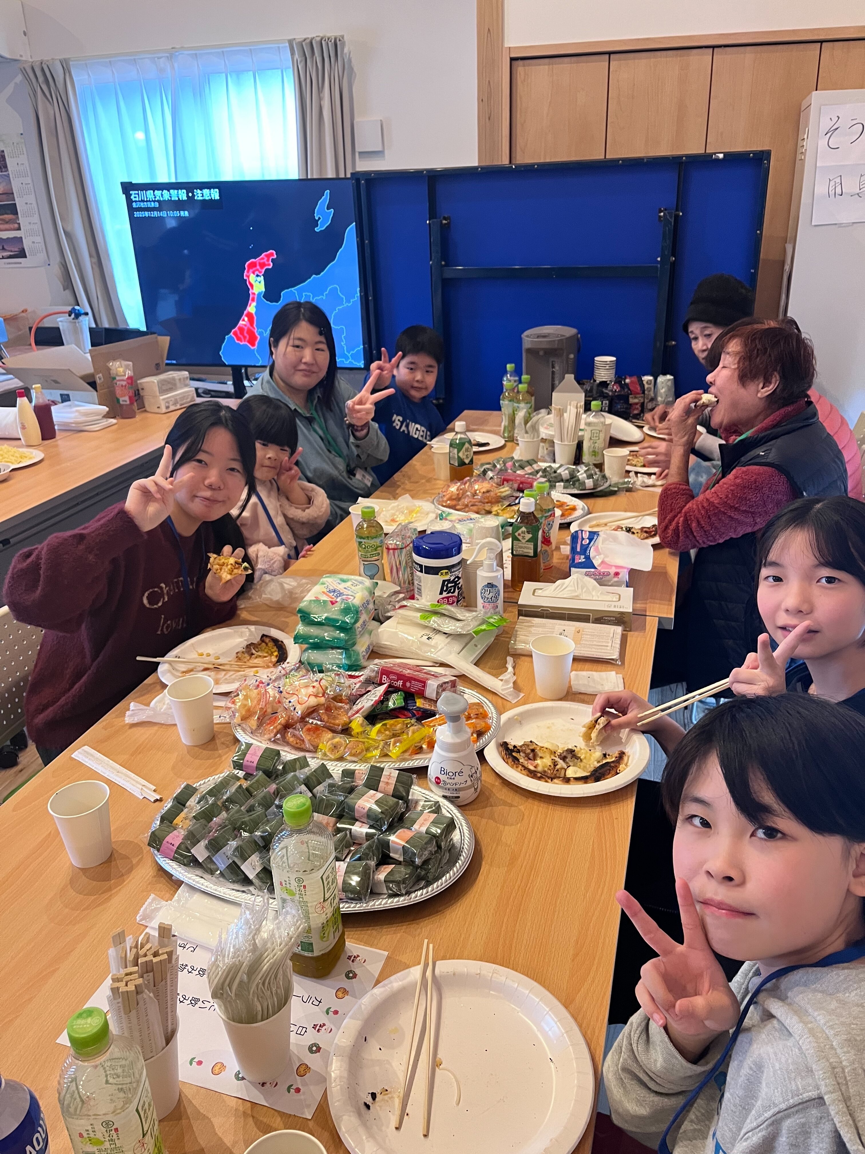 当クラブメンバー11名で早朝に富山を出発し、9月に視察をした輪島市町野地区の仮設住宅集会所をお借りして、子どもたち向けのイベント『のとスマイルフェスタ』を開催しました。メンバーが各コーナーをそれぞれ担当し、事前に申し込みがあった10組の親子の方々や当日飛び入りご参加の住民の皆様を含め、40名近い参加者との交流を楽しみました。
