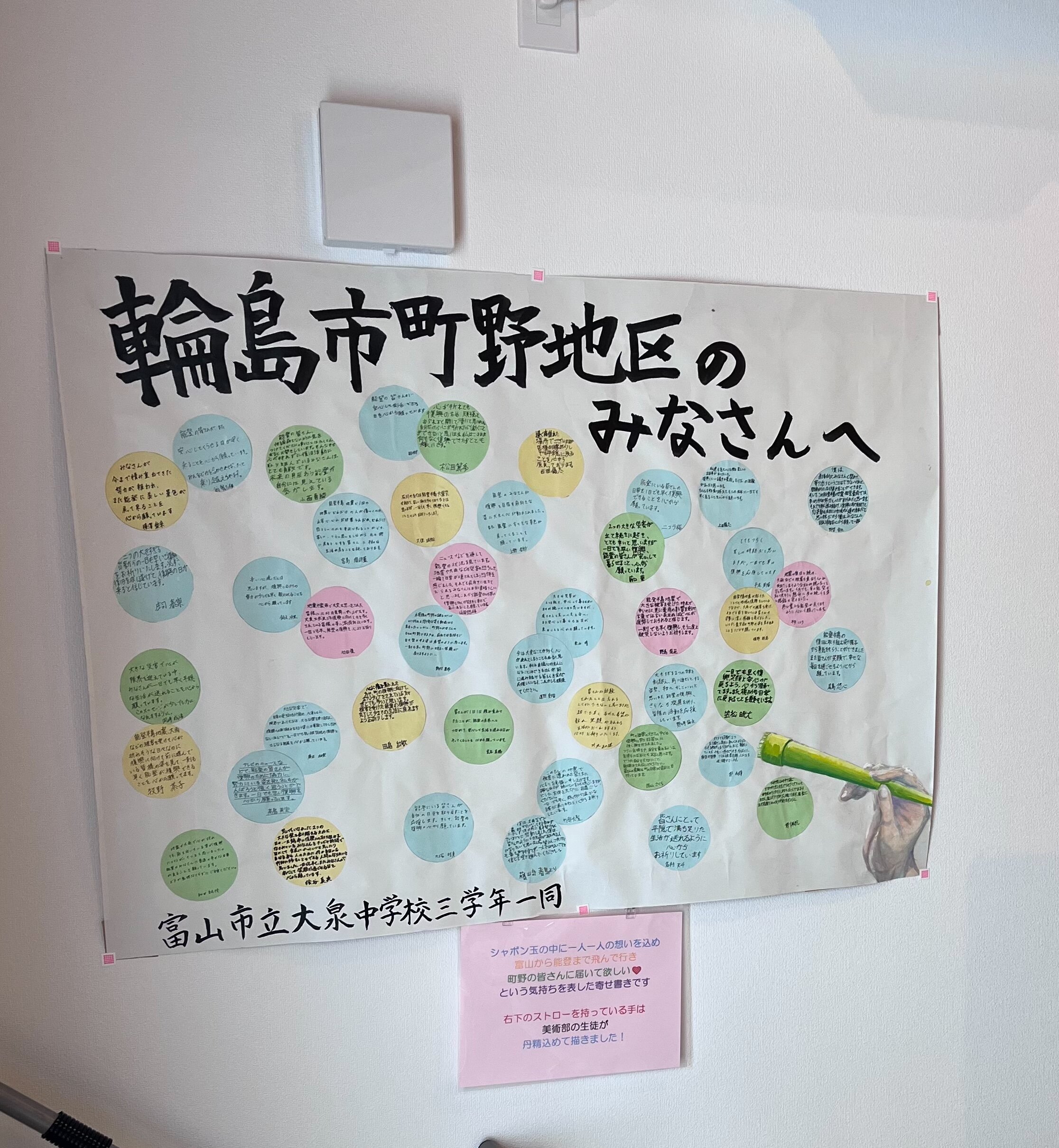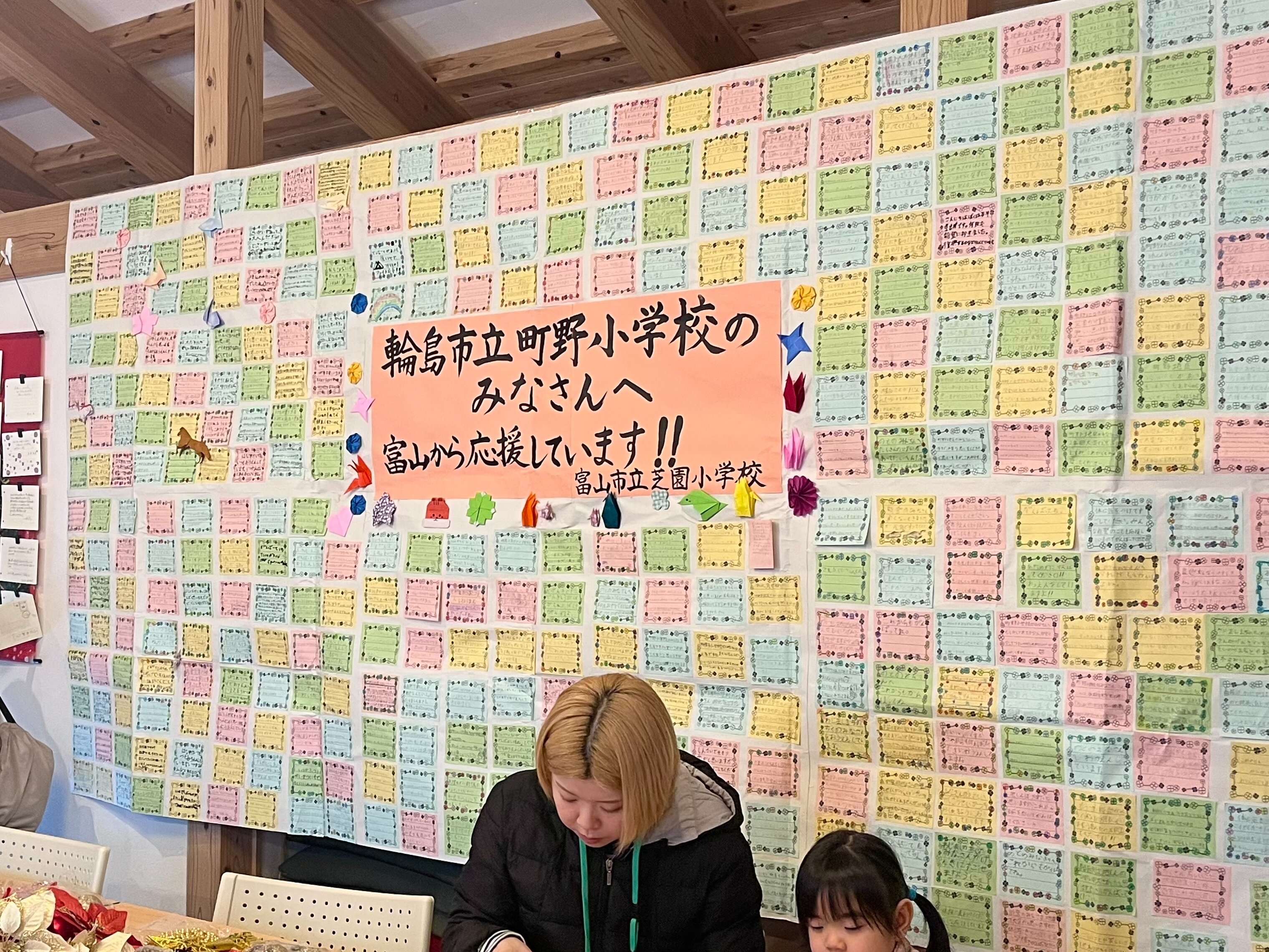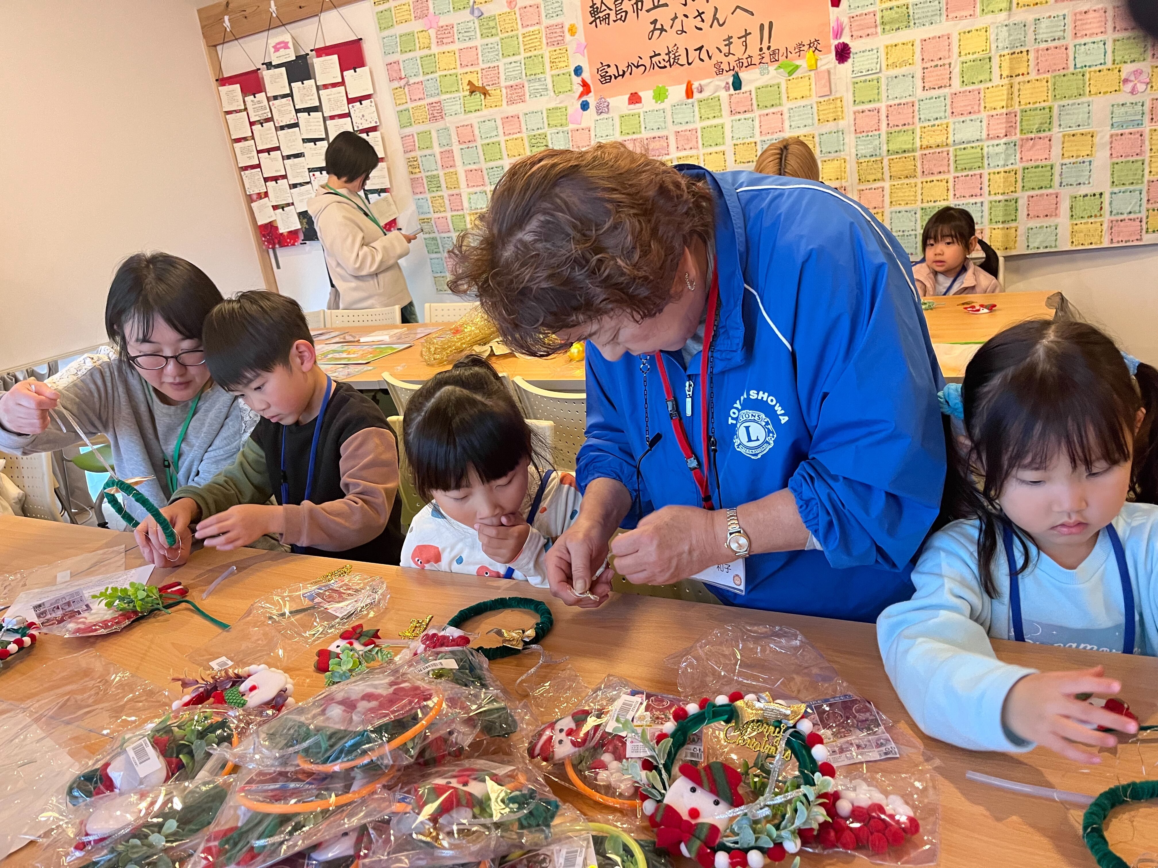 ※ リース作りコーナーの和室には、壁一面に富山市立芝園小学校、大泉中学校の児童生徒の皆さん、そして当クラブメンバーからの応援メッセージがたくさん詰まった寄せ書きを掲示しました。またお土産として富山名物の「ます寿司」をお持ち帰り頂きました。