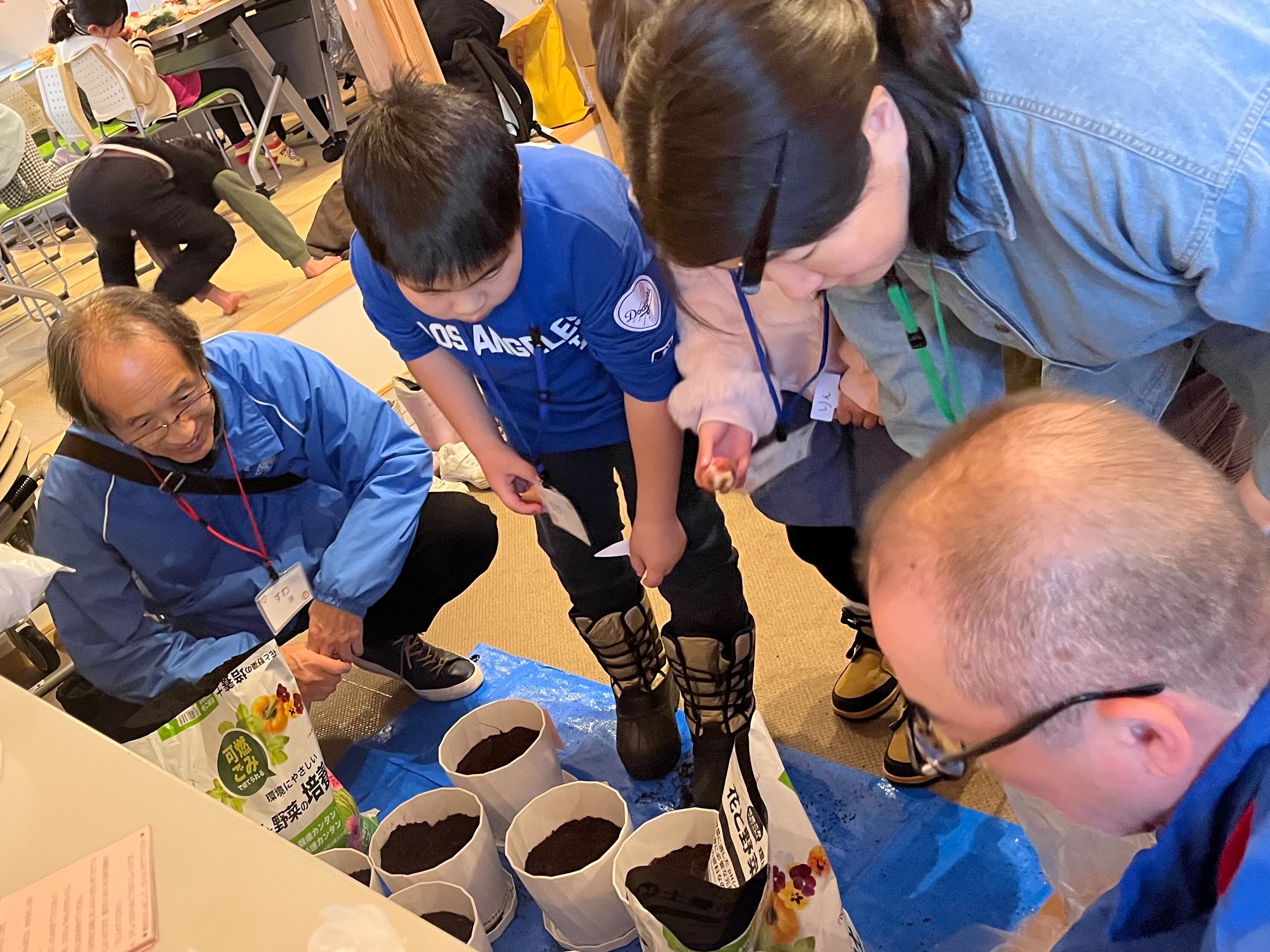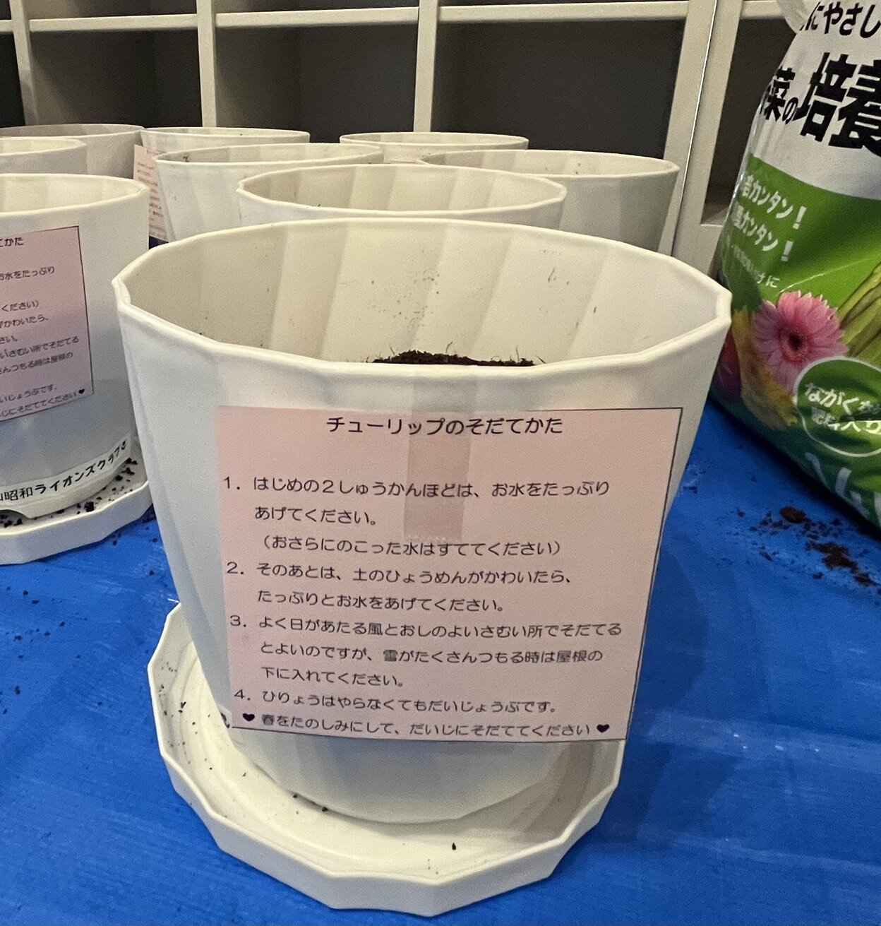 ④ チューリップの球根植えコーナー好きな色の球根を鉢に植えて持ち帰り、春に花が咲くのを楽しみにしながら大事に育ててもらいます。