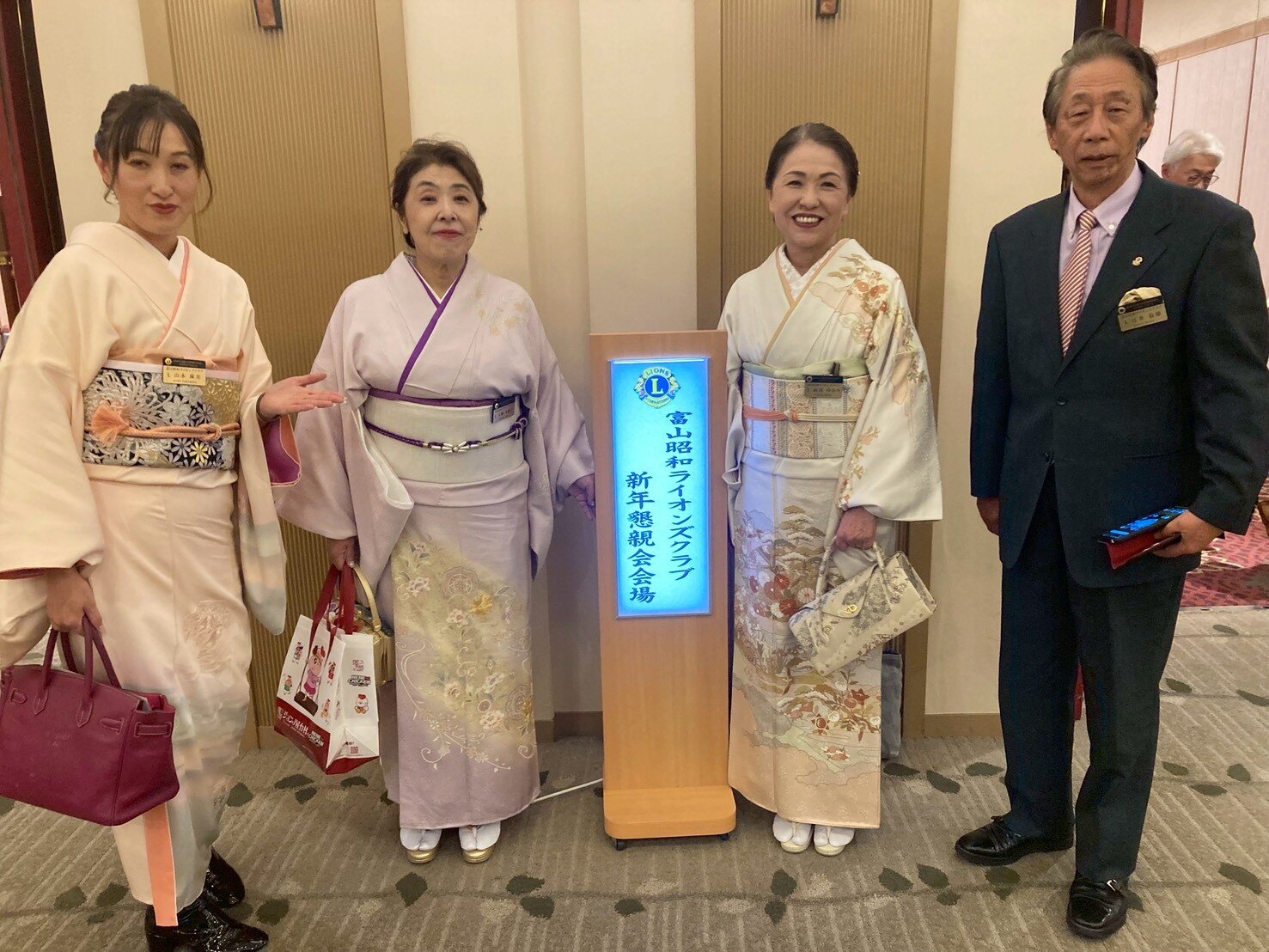 懇親会では、今年傘寿を迎えられたL朝日重剛とL石動勇、また年男のL平井拓磨によるスピーチや、今回の理事会例会で承認された次年度地区キャビネット出向役員の方々による挨拶などがありました。また和服姿の女性メンバーの皆さんがお正月らしさに彩を添え、新しい年を迎えるに相応しく賑やかで華やかな例会となりました。