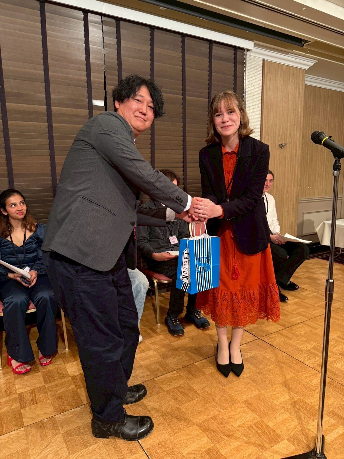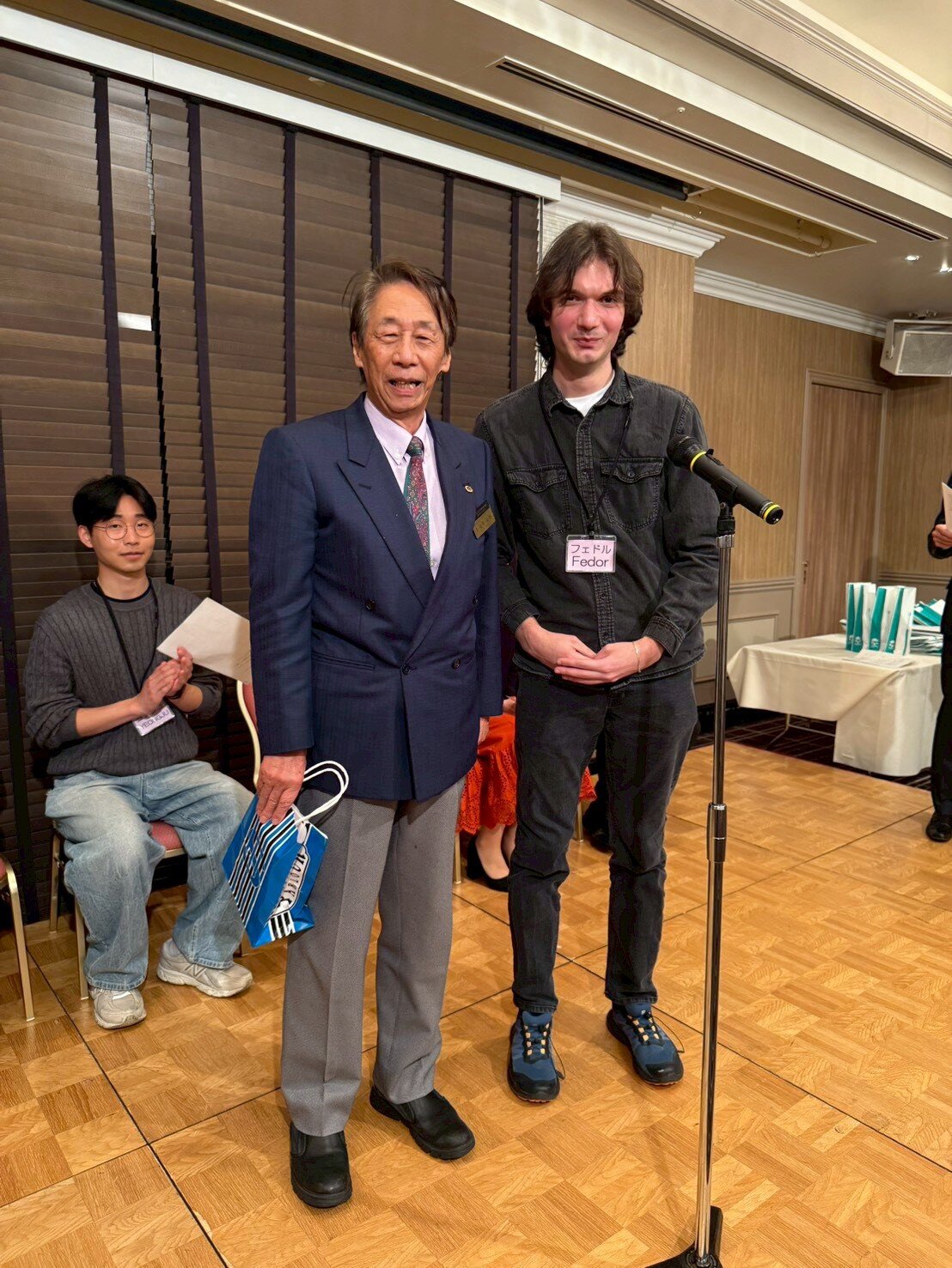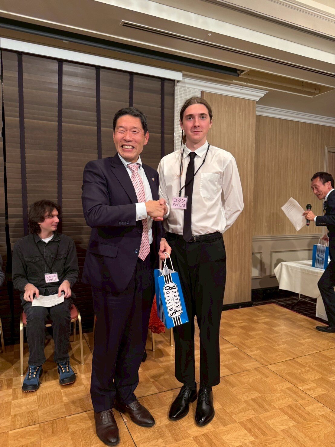 懇親会では、留学生の自己紹介に続いて留学生の出身国(ロシア・ブラジル・セルビア・インド・韓国)に関する3択クイズを行いました。それぞれの留学生から3問ずつクイズが出され、あちこちのテーブルから「わからんじゃー」などの声が聞こえる中、最終的に一番成績優秀な「インターナショナルで賞」は、L花方が見事獲得し、一番正答数が少ない「未だ鎖国で賞」は某Tライオンに授与されました。