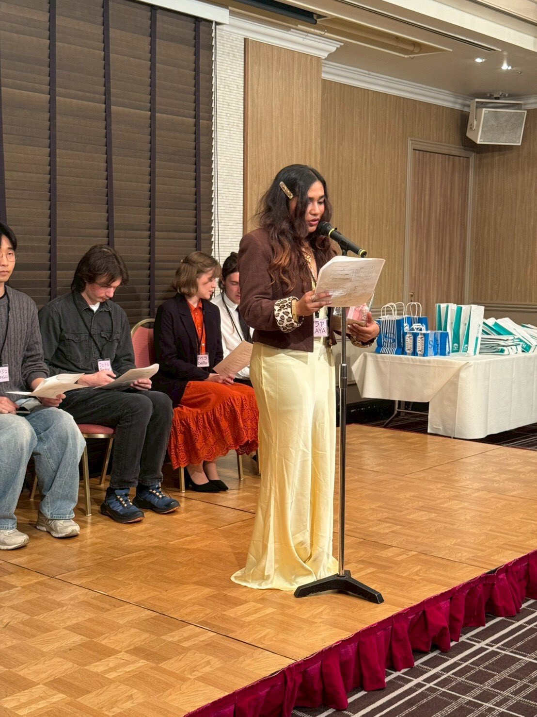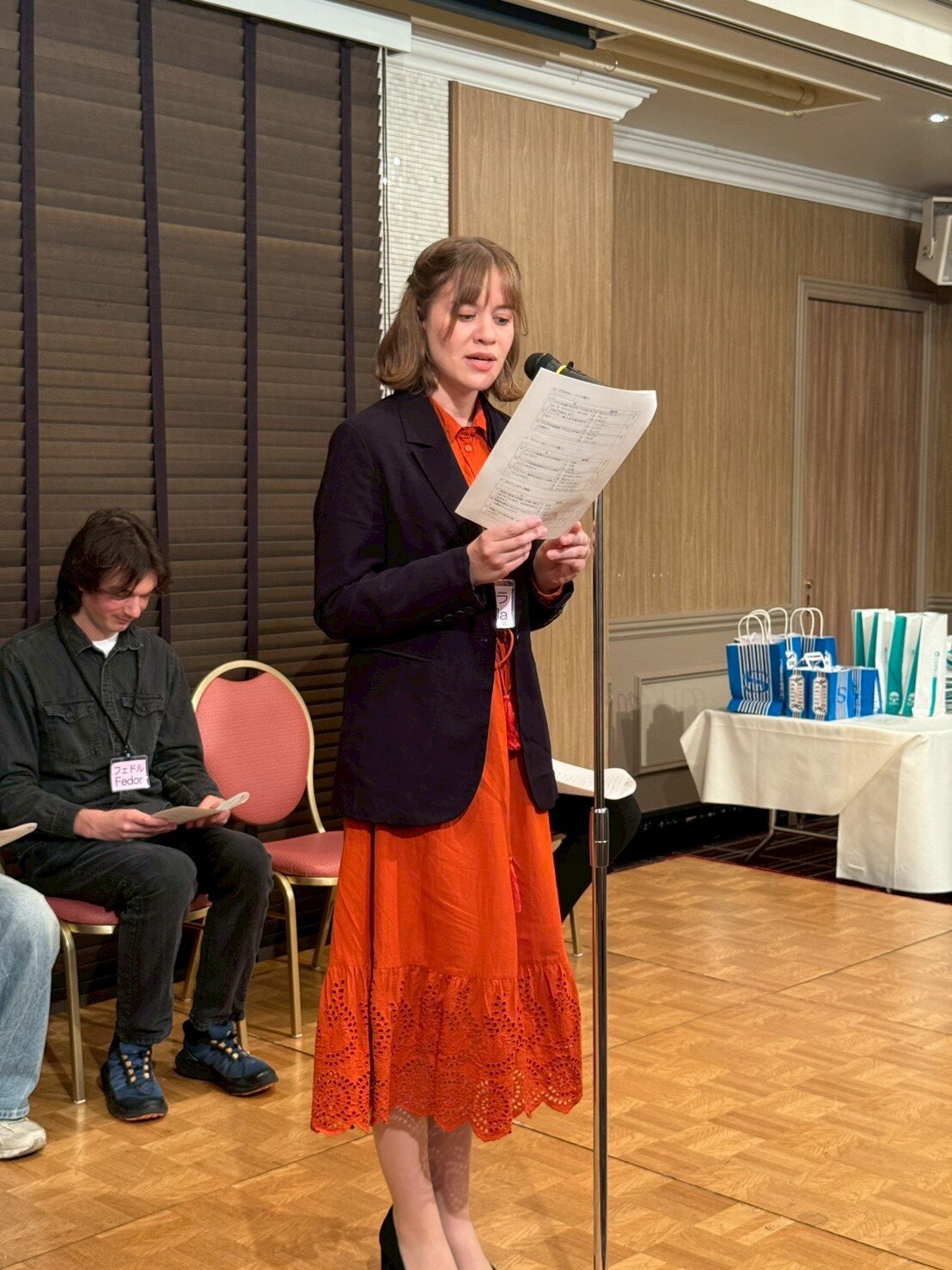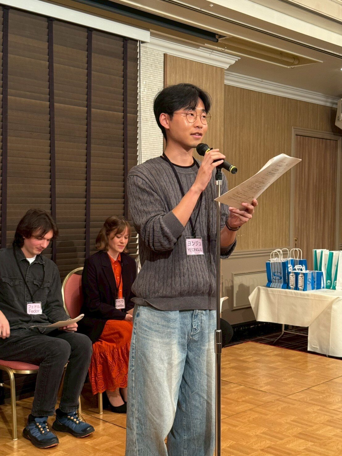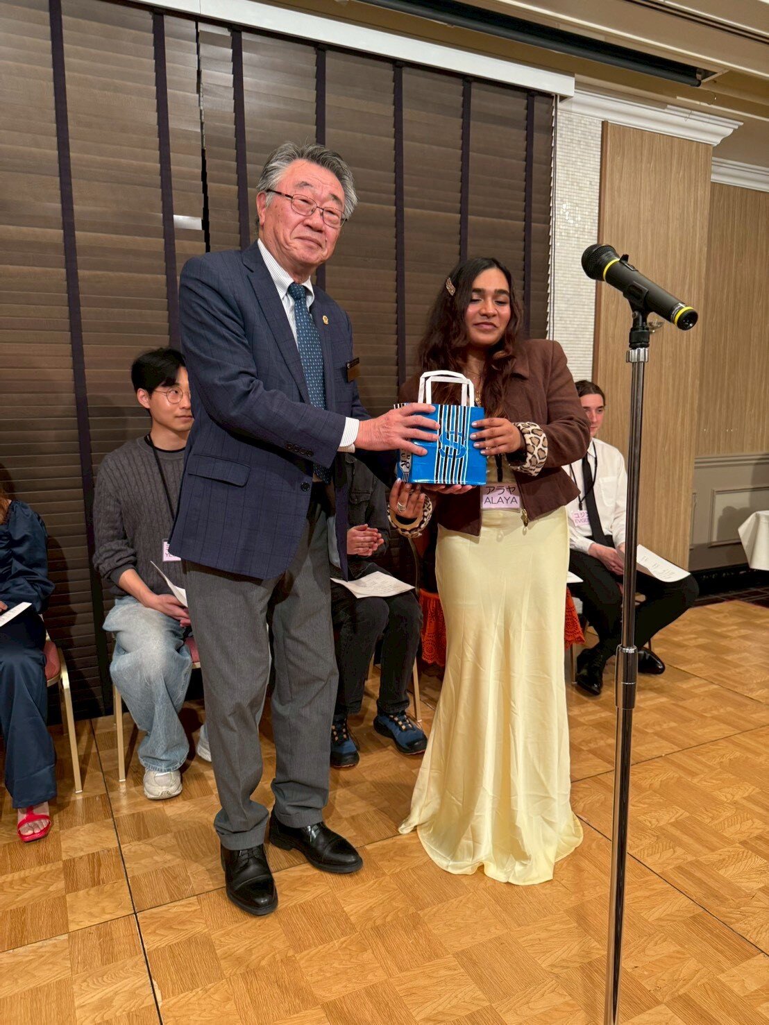 懇親会では、留学生の自己紹介に続いて留学生の出身国(ロシア・ブラジル・セルビア・インド・韓国)に関する3択クイズを行いました。それぞれの留学生から3問ずつクイズが出され、あちこちのテーブルから「わからんじゃー」などの声が聞こえる中、最終的に一番成績優秀な「インターナショナルで賞」は、L花方が見事獲得し、一番正答数が少ない「未だ鎖国で賞」は某Tライオンに授与されました。