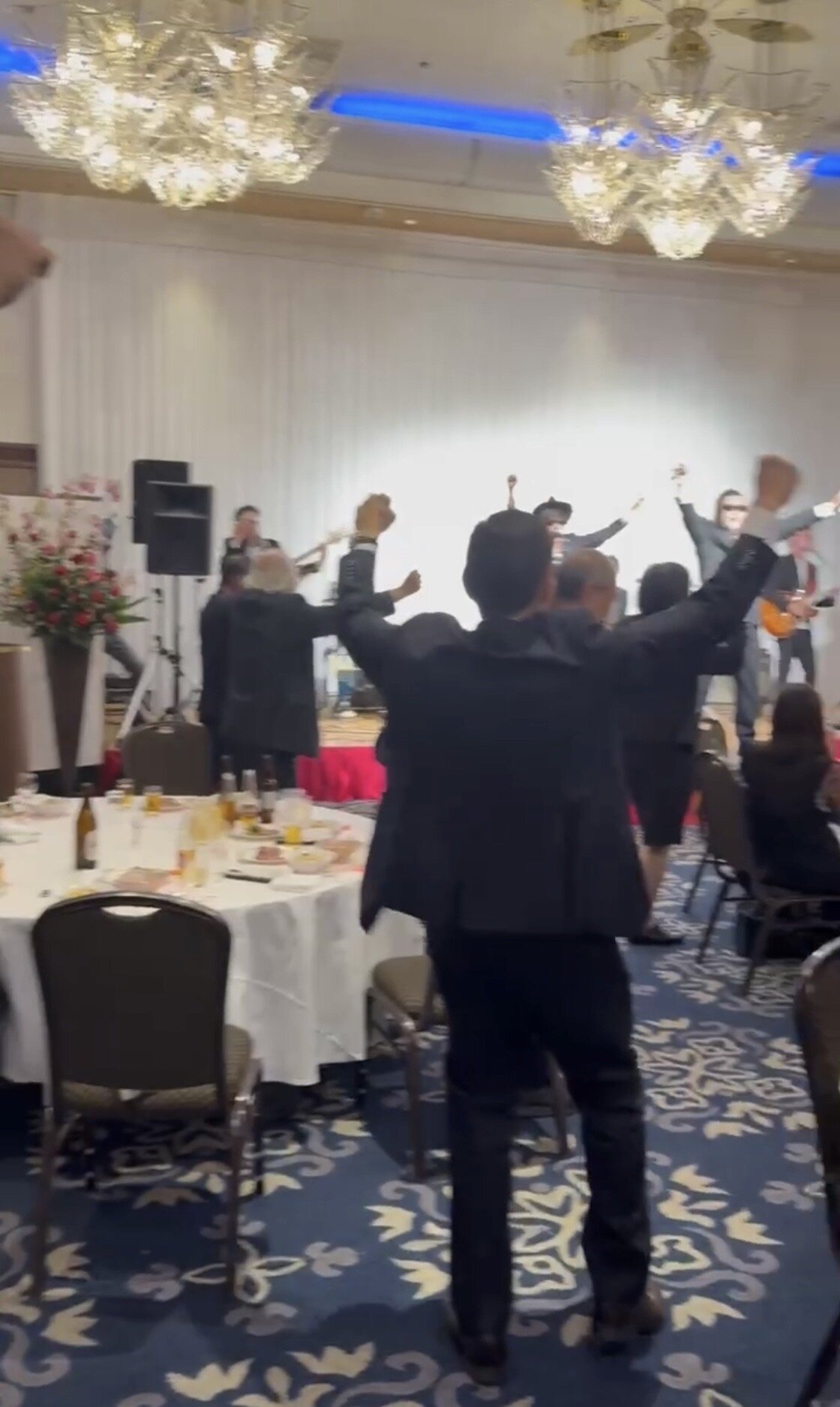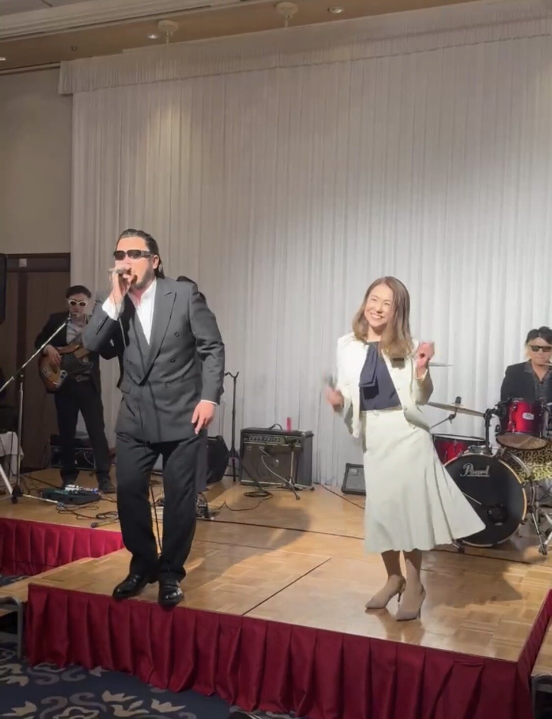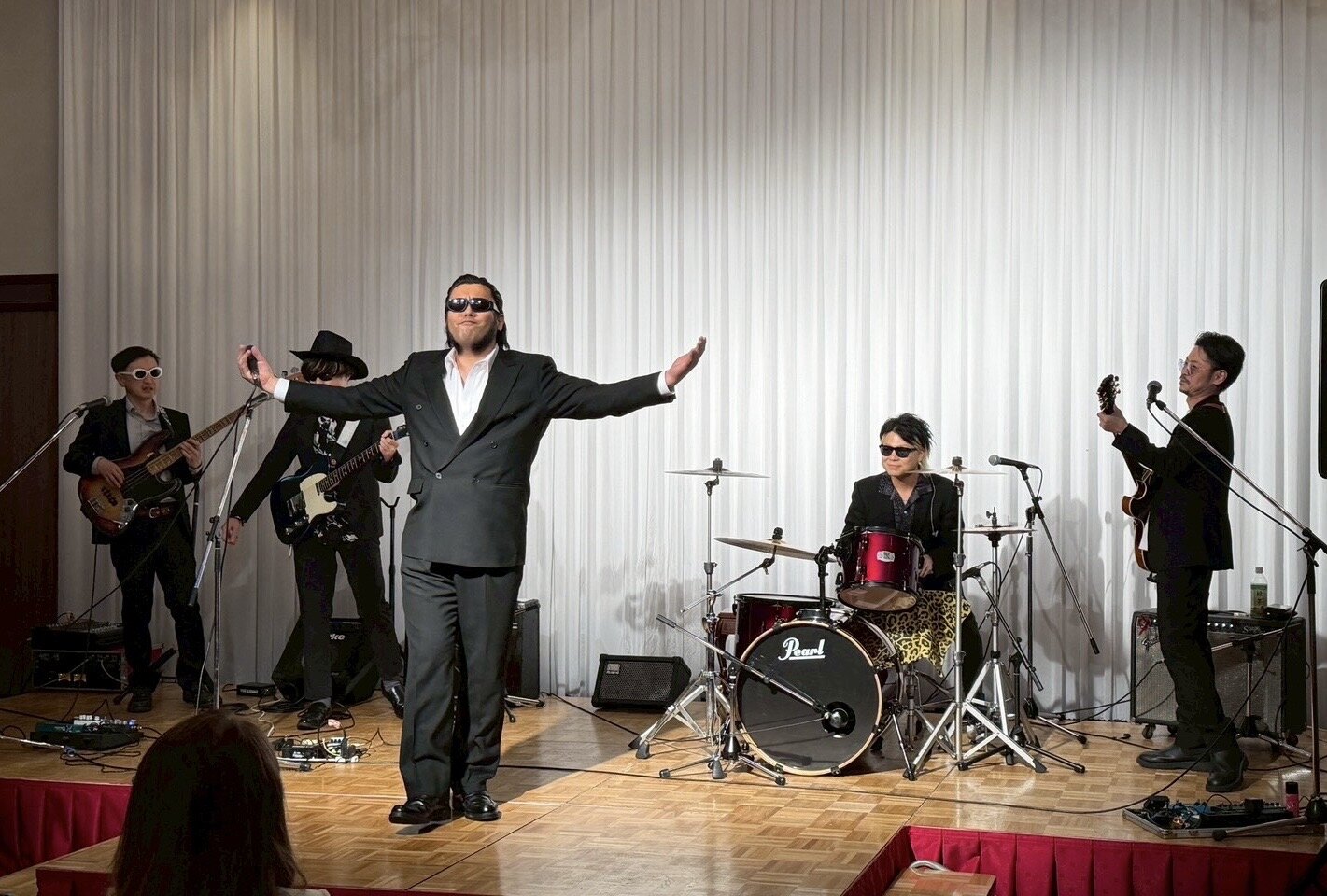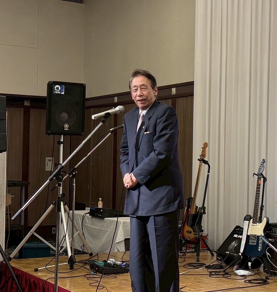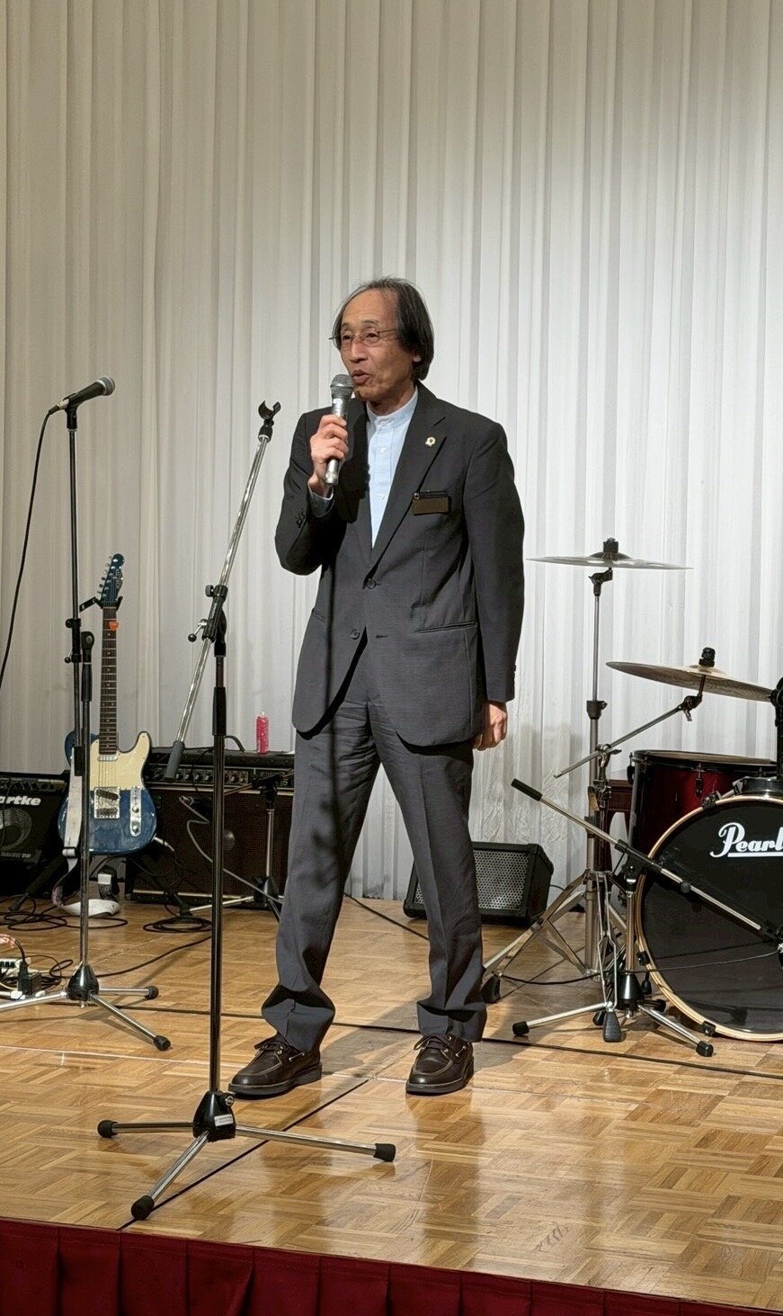 また懇親会では、アトラクションとして、当日のために結成された5人組男性バンド「ジ・だいてやるズ」をお招きし、聞き馴染みのある曲が次々と賑やかに演奏されて、大変盛り上がりました。最後の曲、チャゲ&飛鳥の『YAH YAH YAH』では、ほとんどのメンバーが立ち上がって拳を振りかざして踊り、お陰で肩の痛みが治った人もいたようです(笑)。